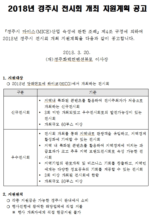 | 제목 | [국내개최지원](경주시) 2018년 경주시 전시회 개최 지원계획 공고 |
