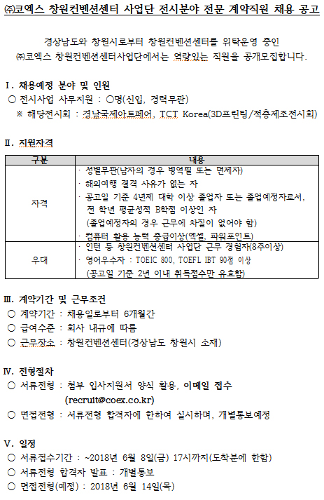 [CECO] ㈜코엑스 창원컨벤션센터 사업단 전시분야 전문 계약직원 채용 공고