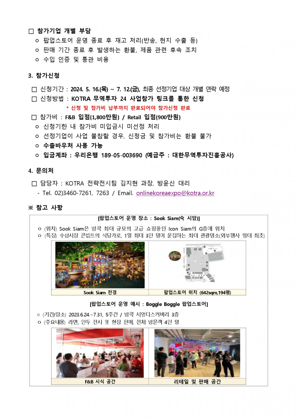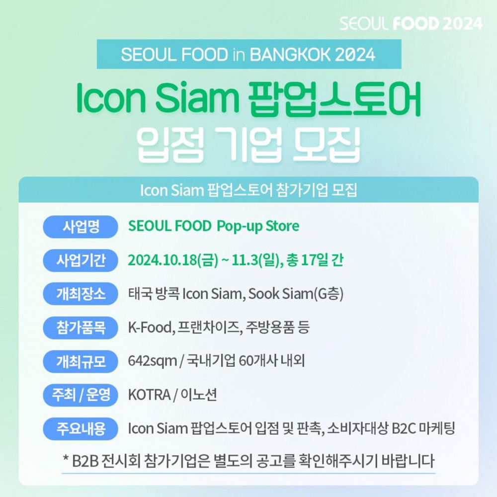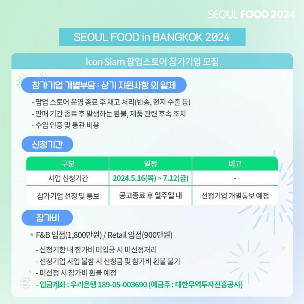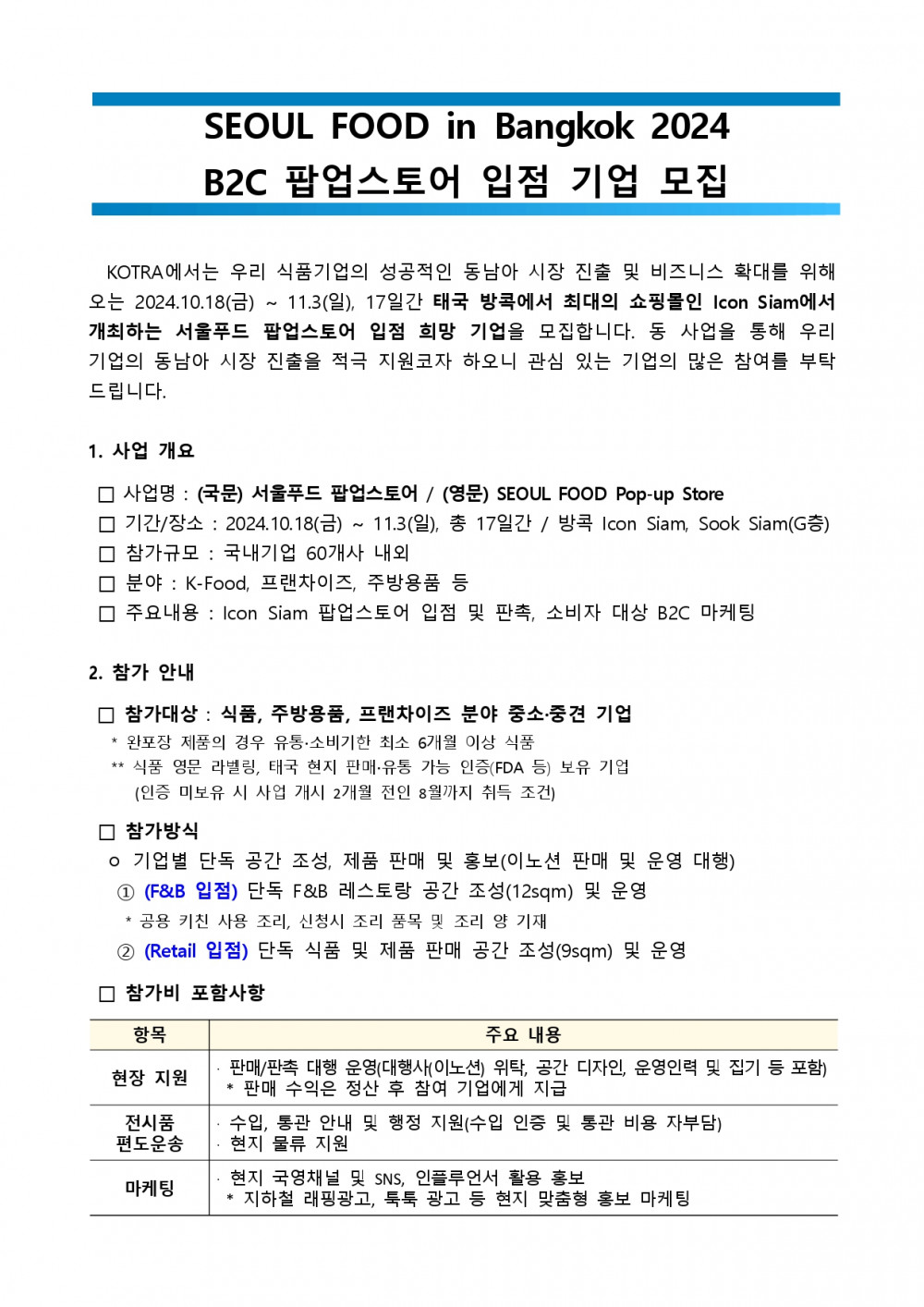 - SEOUL FOOD in BangkokB2C 팝업스토어 모집공고문0712ver.pdf (325.0K) 356회 다운로드 | DATE : 2024-07-03 14:13:25