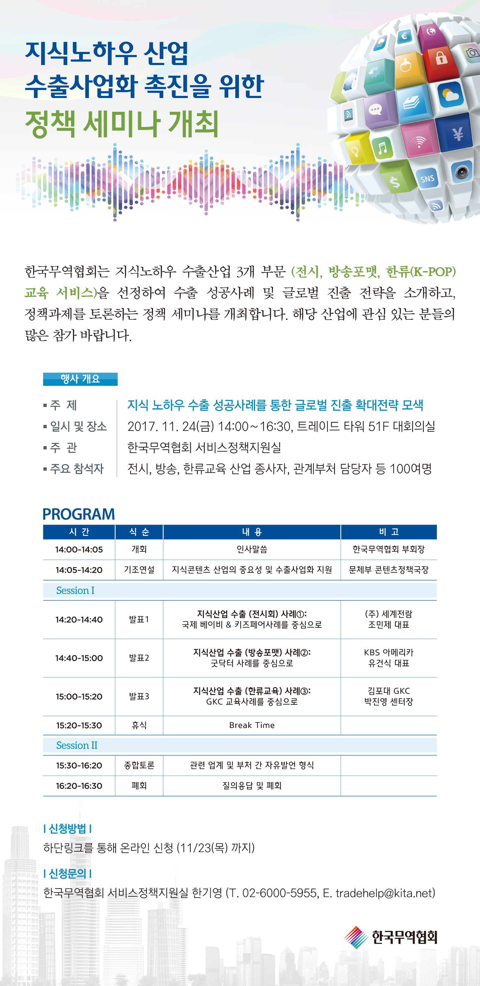 | 제목 | [안내](한국무역협회) 지식노하우 산업 수출사업화 촉진을 위한 정책 세미나 개최(전시 사례 포함) |