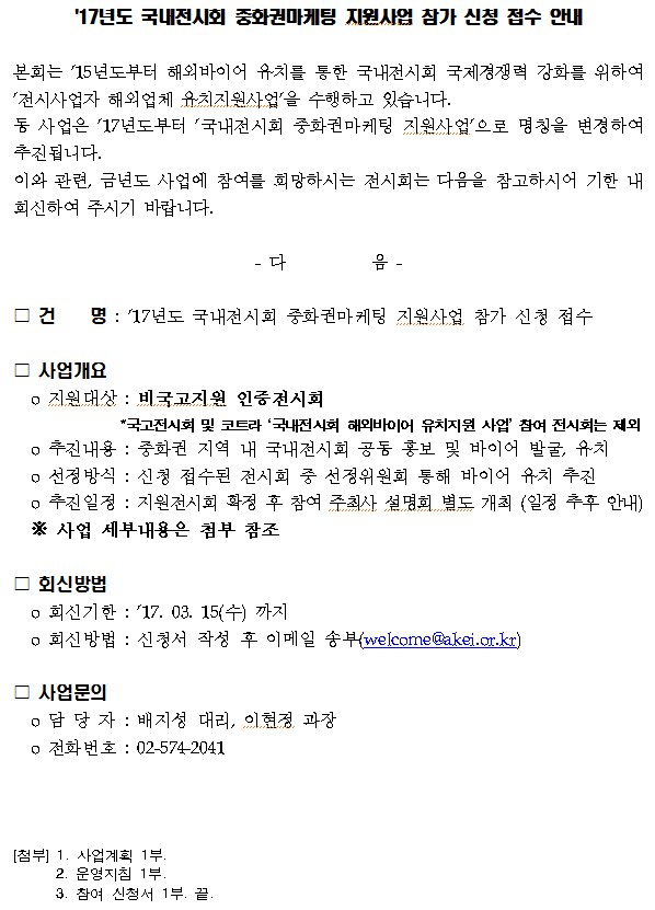 | 제목 | [안내](진흥회) 17년도 국내전시회 중화권마케팅 지원사업 참가 신청 접수 안내 |