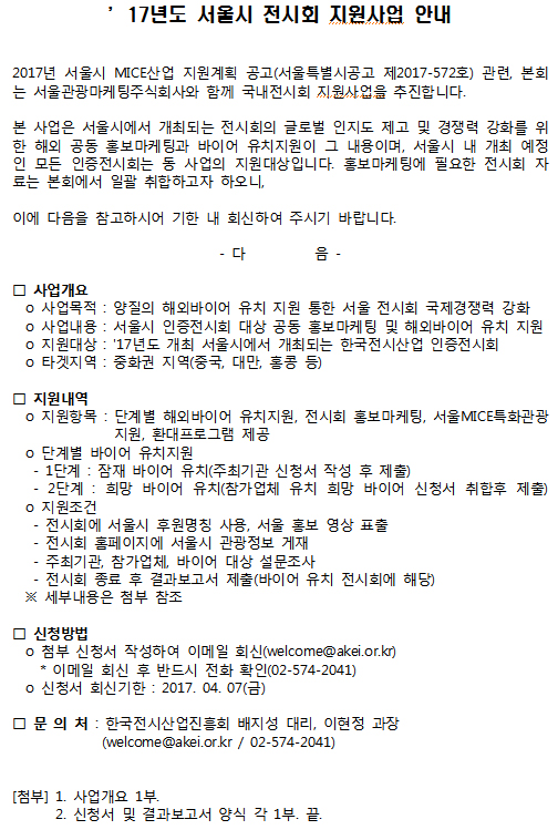| 제목 | [안내](서울시) ’17년도 서울시 전시회 지원사업 안내 |