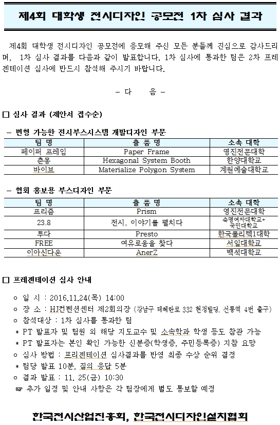 | 제목 | [안내](진흥회) 제4회 대학생 전시디자인 공모전 1차 심사 결과 |