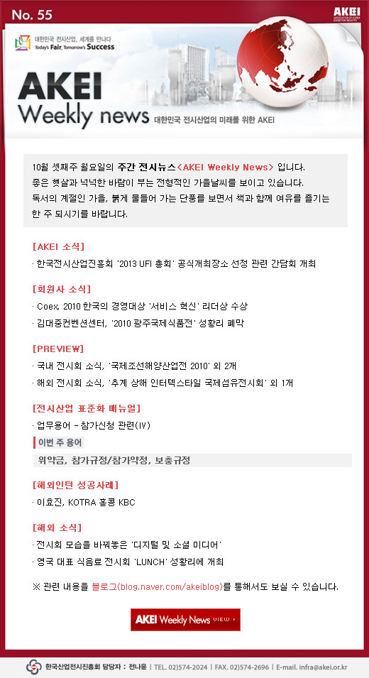 | 제목 | [안내](진흥회) WN 55호 '2013 UFI 총회 공식개최장소 선정 관련 간담회 개최' 외 |