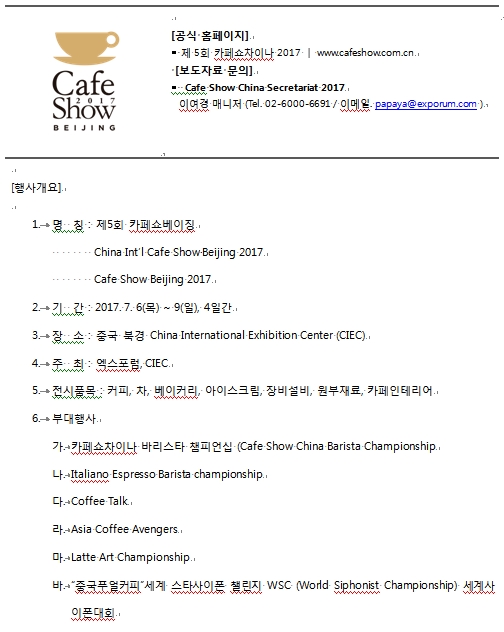 [2017년 7월 6일] 올해로 벌써 5회째를 맞이한 제5회 카페쇼베이징 (Cafe Show Beijing 2017)이 엑스포럼과 중국 정부산하기관인 CIEC (China International Exhibition Center)의 공동주최로 7월 6일부터 9일까지 4일동안 중국 북경 CIEC(China International Exhibition Center)에서 개최된다.