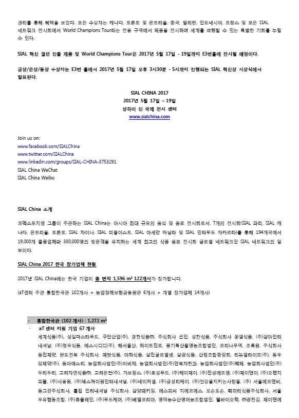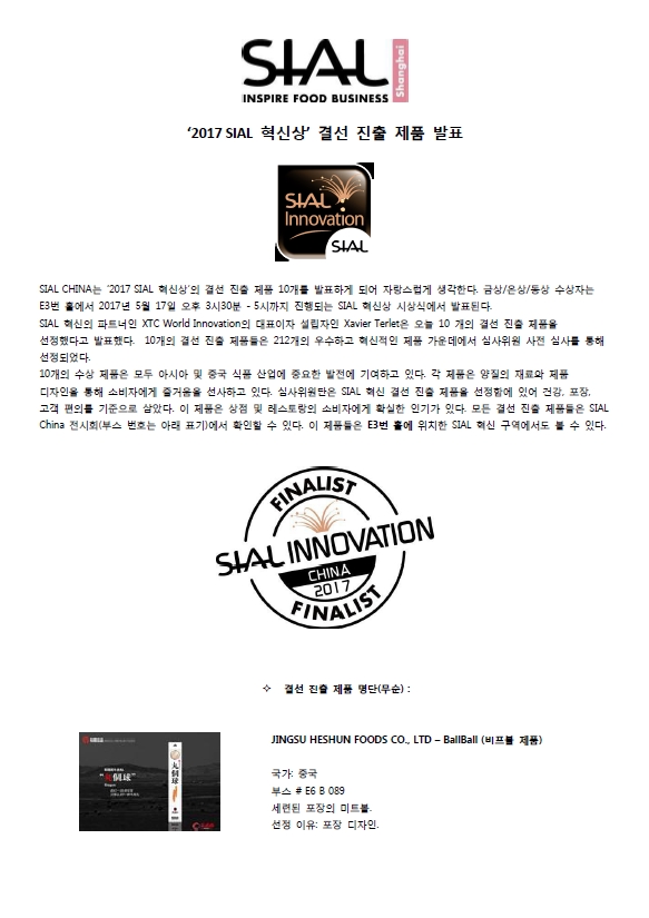| 제목 | ‘2017 SIAL 혁신상’ 결선 진출 제품 발표 |